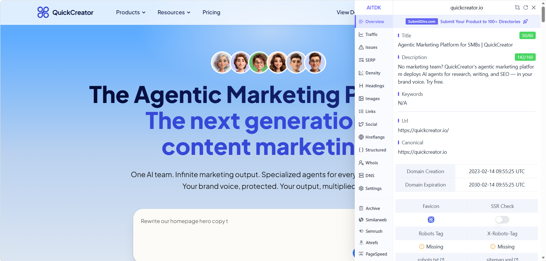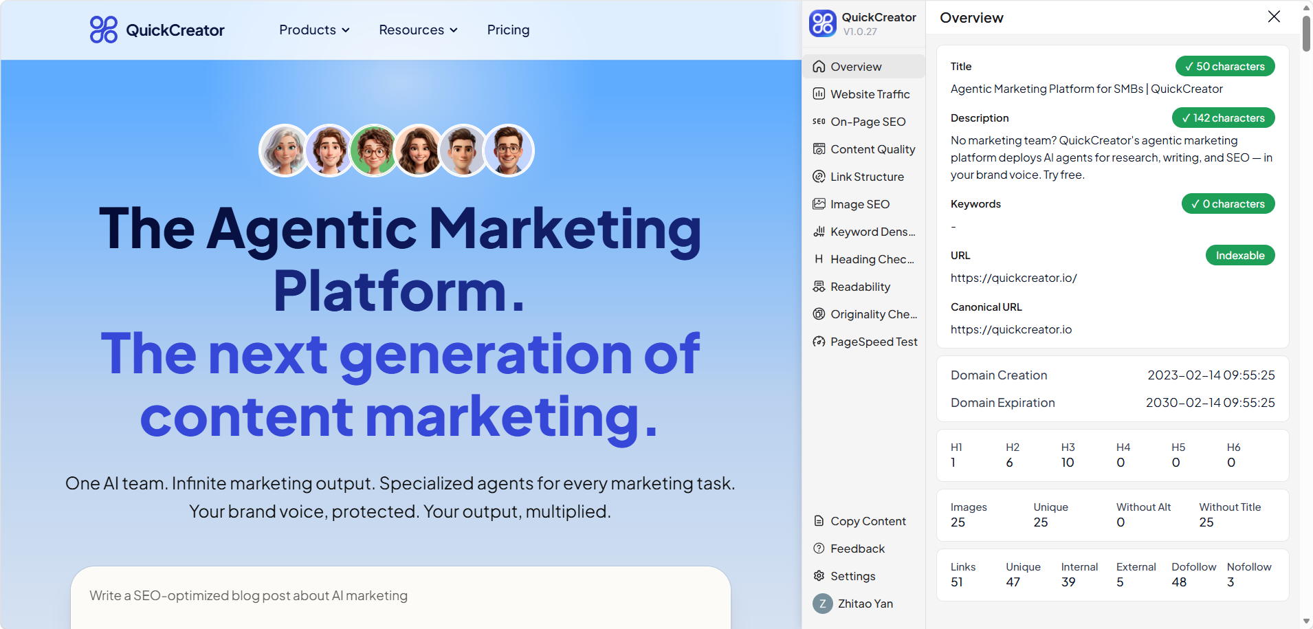 QuickCreator includes the core checks teams expect from an on-page SEO checker Chrome extension, including: