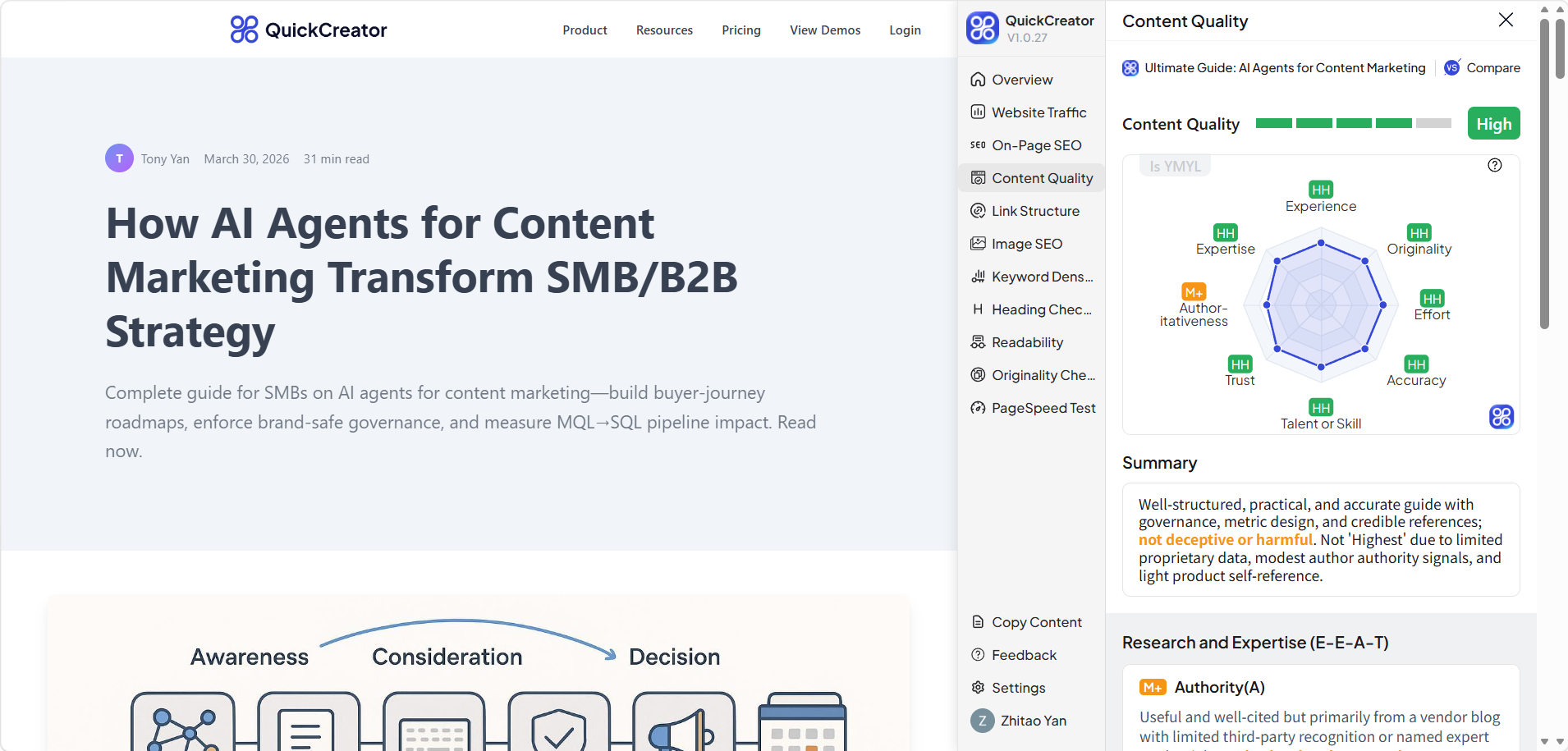 QuickCreator’s extension describes Article E‑E‑A‑T analysis with a checklist to strengthen bylines, sources, and evidence (see the QuickCreator Extension Chrome Web Store listing).