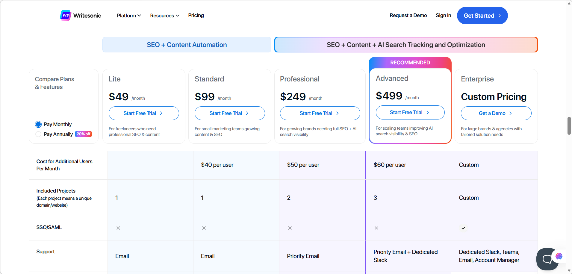 Official, canonical pricing matrices on writesonic.com were not clearly discoverable during our research window; treat any in‑app pricing as authoritative and current.